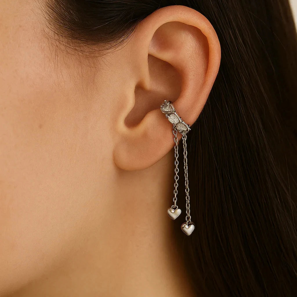 Ear Cuff Corazones — Accesorios Plateados con Cristales y Dijes en Forma de Corazón